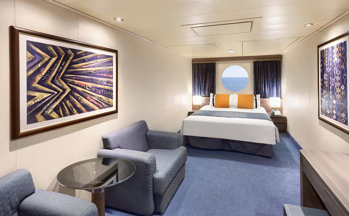 Aqui, a experiência começa antes mesmo do embarque. Além da varanda privativa e do pacote de bebidas incluso, essa categoria oferece embarque e desembarque prioritários, jantar em restaurante reservado e localização privilegiada.